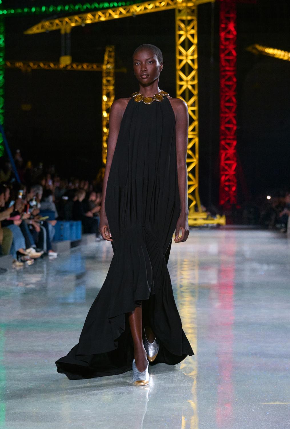 A growing sense of iridescence, combined with the silken, sinuous, and fluid, is further embraced as day turns into the nocturnal world of flight. Here, the ‘papillon de nuit’ emerges. Streamlined coats and dresses in sylphen styles, cut, cascading, stark or ornamented, now lead, still with a sense of dynamism at their core. Made for movement, the wearer is propelled into the night.