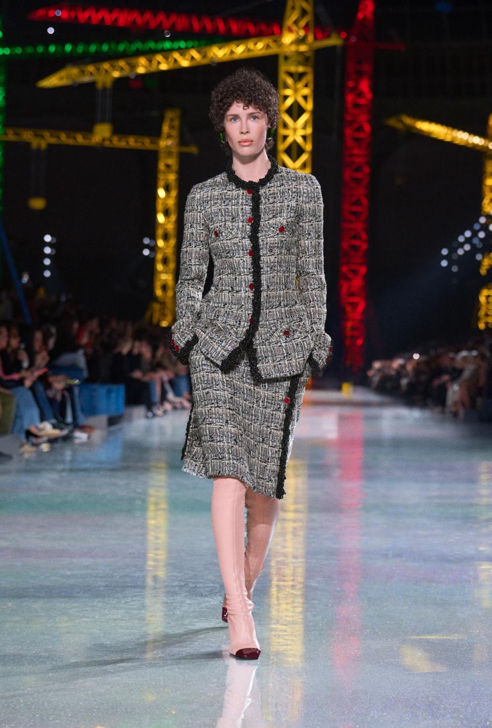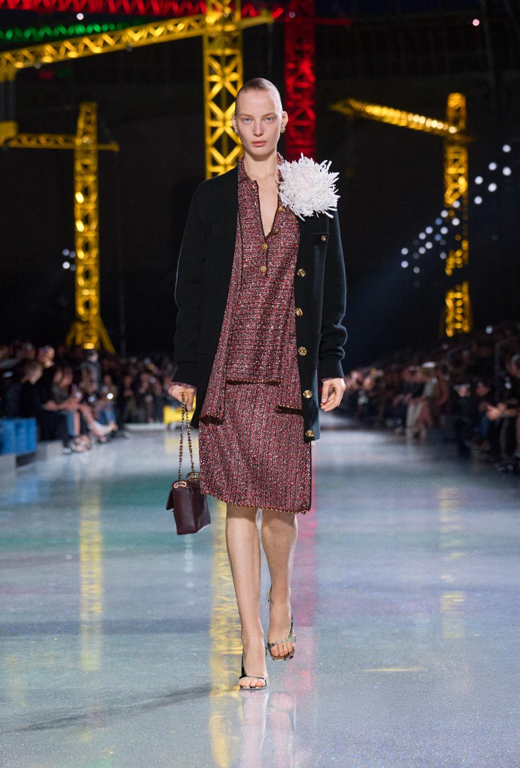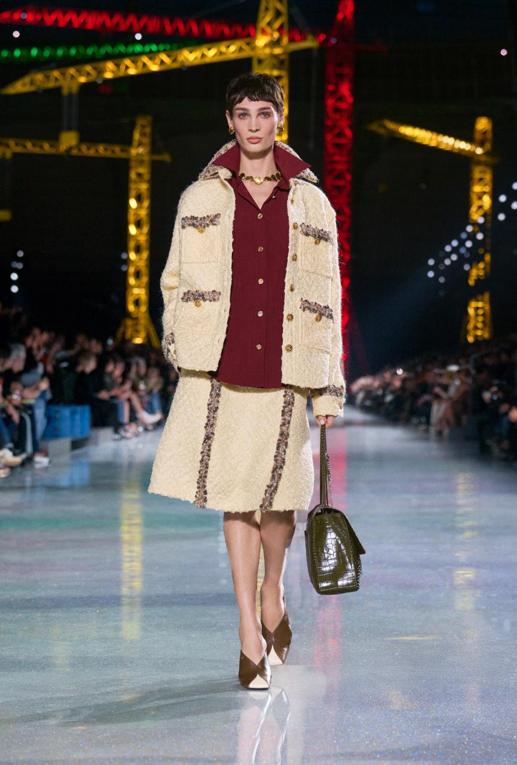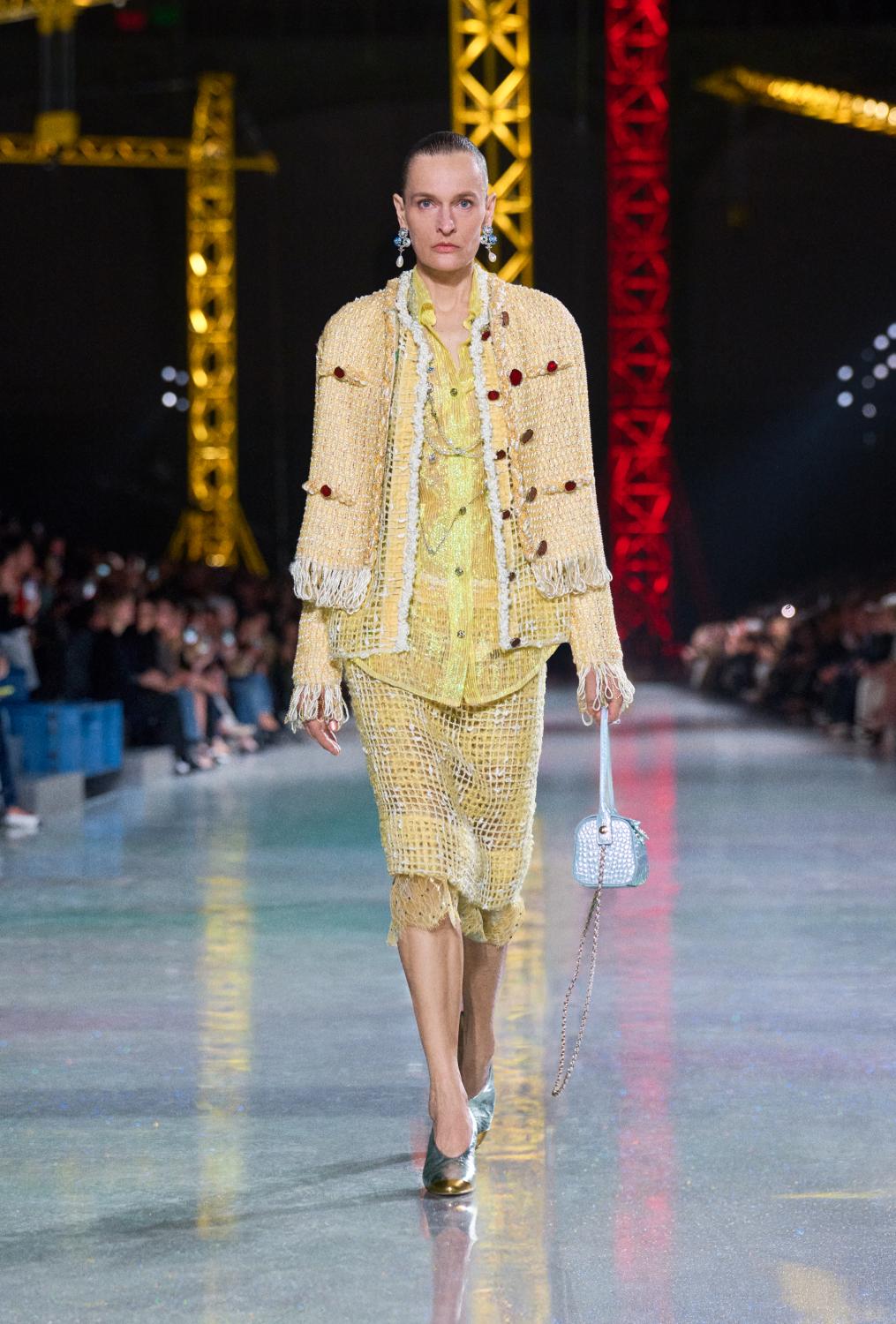 The suit serves as the central canvas, ready to reflect whoever wears it. Boldly reimagined, it encompasses ribbed knits to classic tweeds and intricate fabrics woven with artificial fibres, lurex, and silicone alongside natural gauze. From the signature ‘work shirt’ in boucle-tweed and the masculine pressed-tweed blouson—both now integral to the new suiting language. By way of fluidity, lightness, and ease in twenties-style silk jersey, interwoven with tweed. To new techniques, introduced in beaded, knitted suits that demonstrate exceptional lightness and mobility.