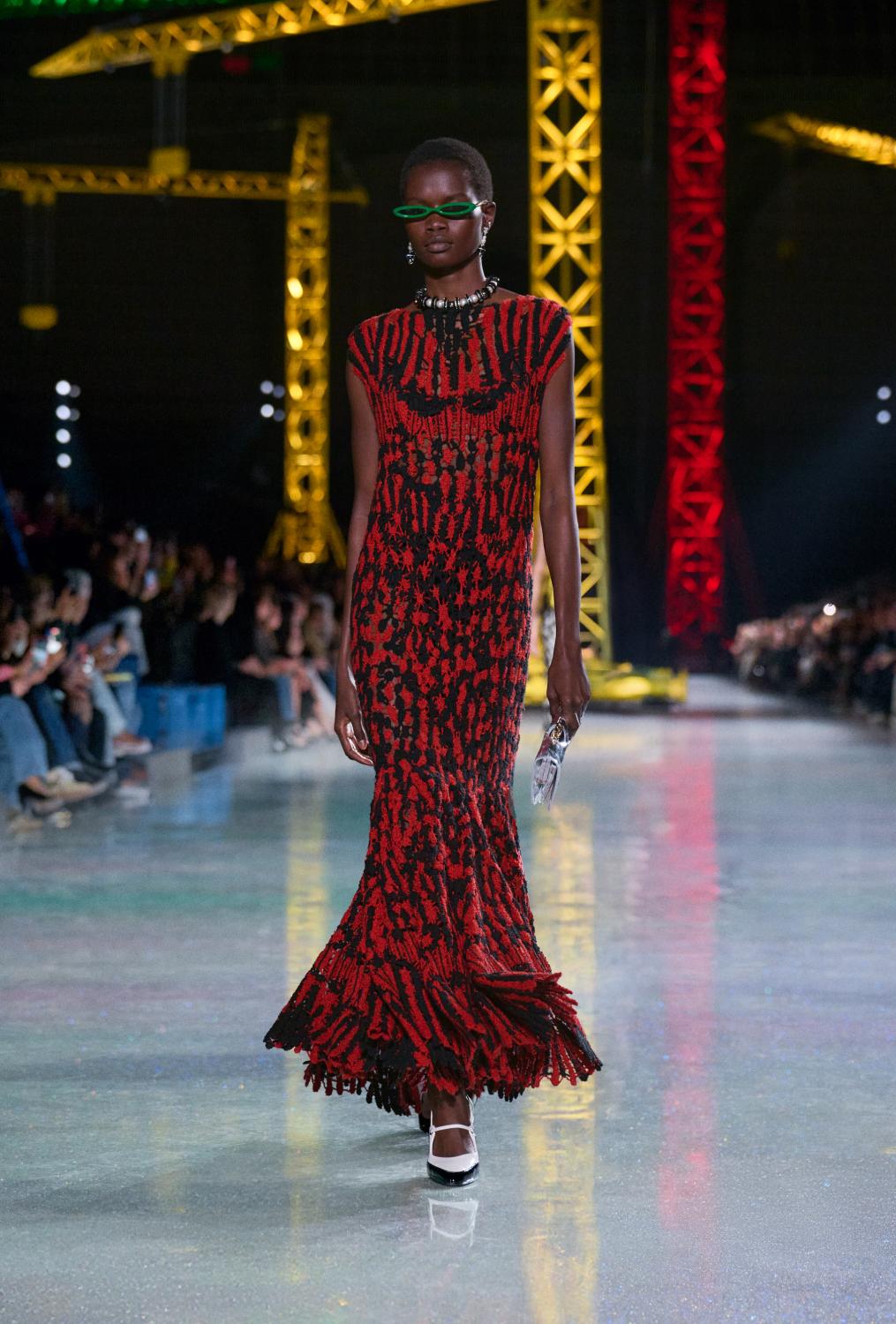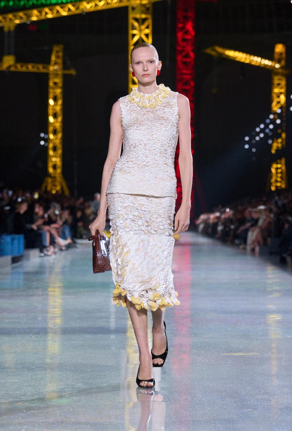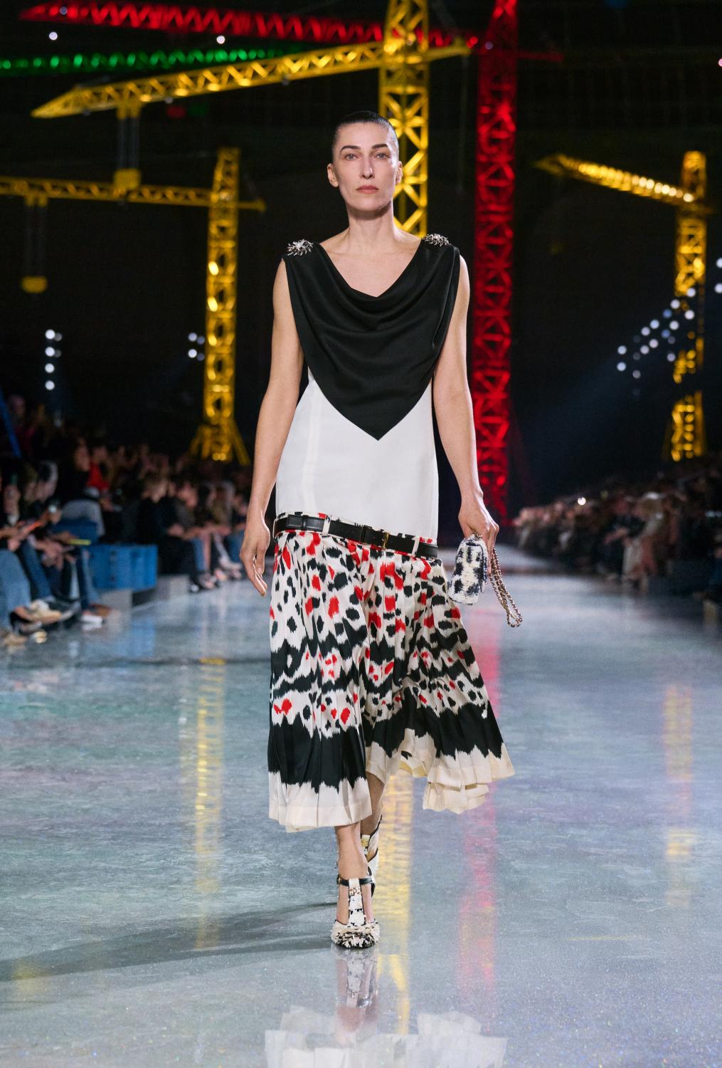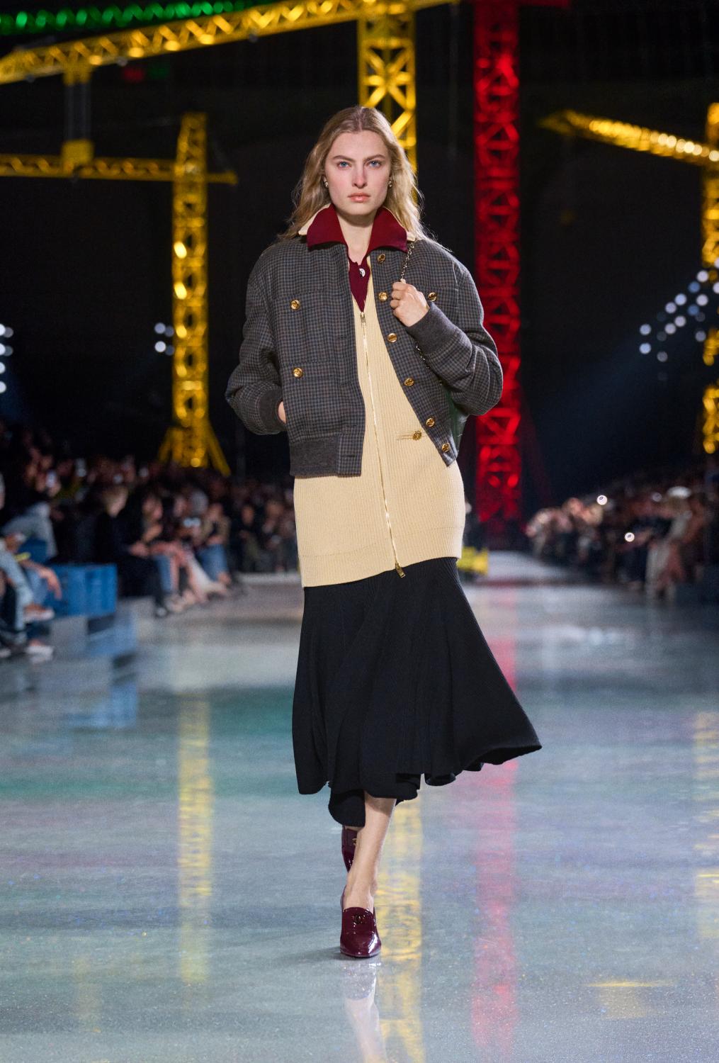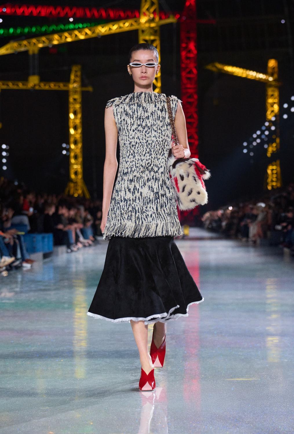 The suit serves as the central canvas, ready to reflect whoever wears it. Boldly reimagined, it encompasses ribbed knits to classic tweeds and intricate fabrics woven with artificial fibres, lurex, and silicone alongside natural gauze. From the signature ‘work shirt’ in boucle-tweed and the masculine pressed-tweed blouson—both now integral to the new suiting language. By way of fluidity, lightness, and ease in twenties-style silk jersey, interwoven with tweed. To new techniques, introduced in beaded, knitted suits that demonstrate exceptional lightness and mobility.