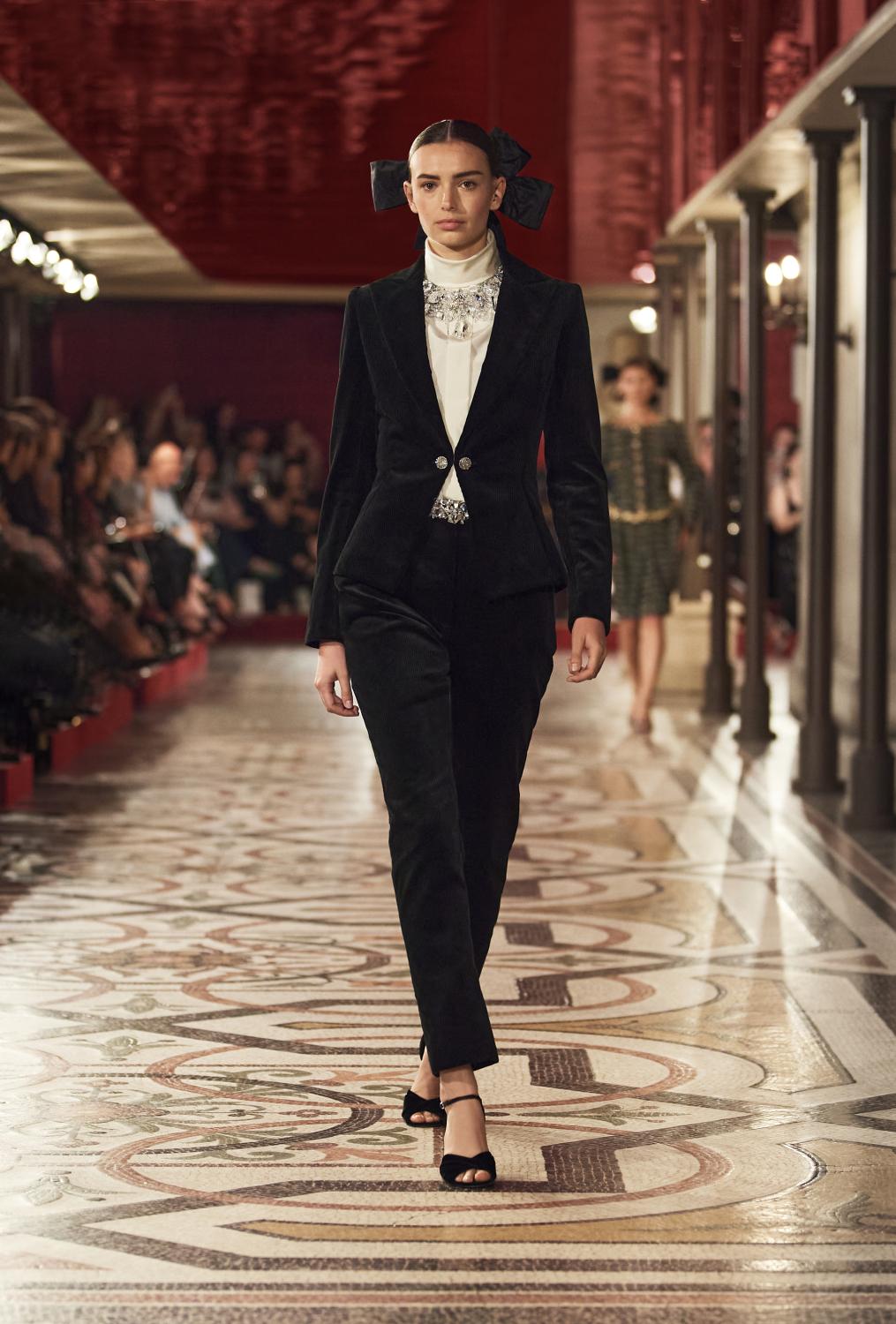 Ici, l’univers de la Haute Couture rencontre celui de l’opéra. Plumes, pampilles, cabochons et fleurs brodées, galons précieux, jersey laqué, tweeds souples, velours soyeux, tulle illusion, taffetas et satin duchesse : les matières sont opulentes et bruissent délicatement. Les volumes sont aériens, les manches bouffantes et les volants plissés. Richement brodée, la collection revisite les codes de la Maison et leur donne des élans romantiques. Tailleur CHANEL à plis creux revisité en tweed bordeaux gansé de satin blanc, smoking noir en velours côtelé et blouse blanche à plastron brodé, tailleur noir avec longue jupe-culotte et veste courte ajustée aux épaules enveloppées de plumes noires, dansent au milieu des longs manteaux, capes amples et robes du soir, évoquant avec modernité une tradition scénique et une certaine science de l’apparat.