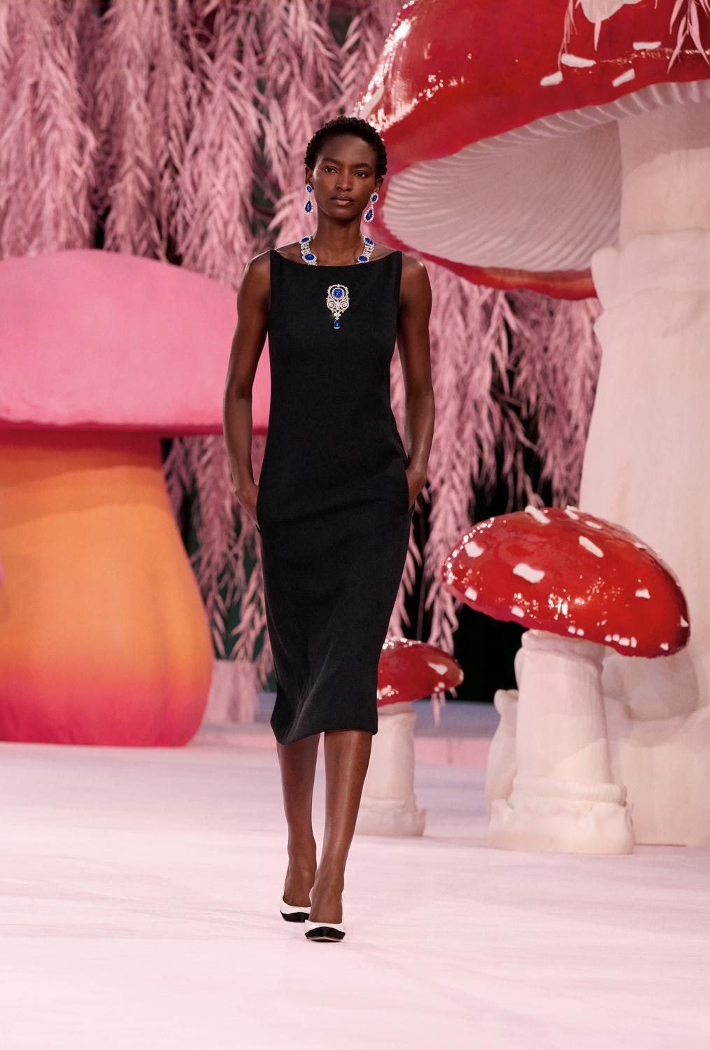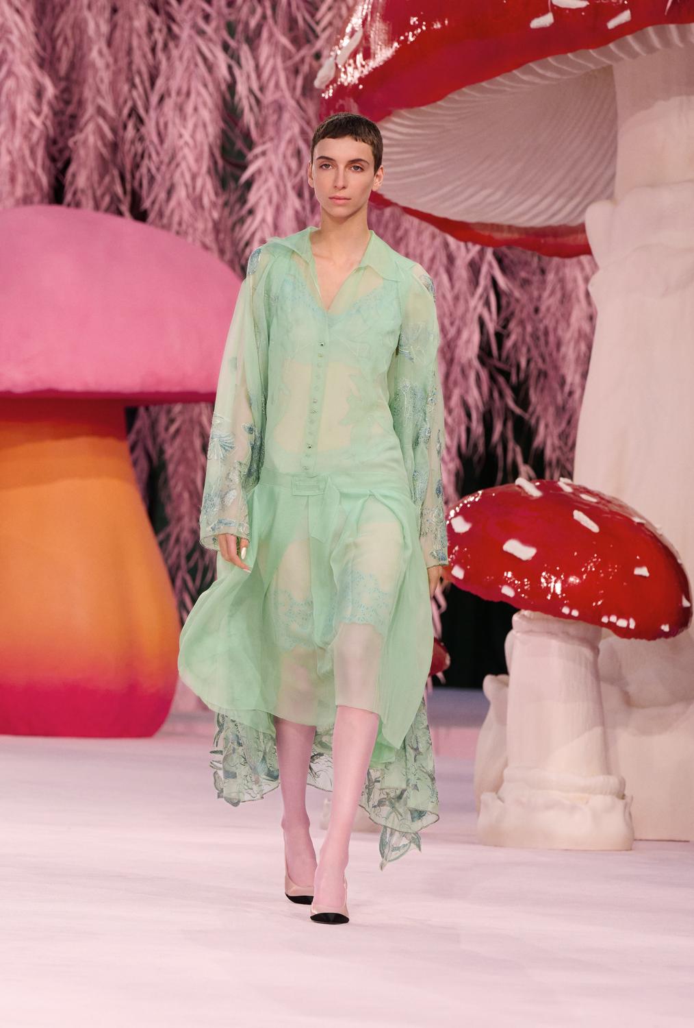 Looks noir corbeau, concentré des savoir-faire exceptionnels des ateliers flou et tailleur, plumages complexes et colorés façonnés et sublimés par la broderie, les superpositions, le plissage et le tissage : l’idée de la plume traverse la collection, mais rarement traitée dans sa forme naturelle. Apparaissent toutes sortes d’oiseaux, comme par magie, du plus familier au plus rare : du simple pigeon gris à l’extravagante spatule rosée, du héron élancé au cacatoès huppé. À la manière d’un groupe de corbeaux ou de pies malicieuses, les oiseaux se rassemblent autour de gigantesques champignons dans une forêt de saules enchantée, avant de prendre leur envol, libres.