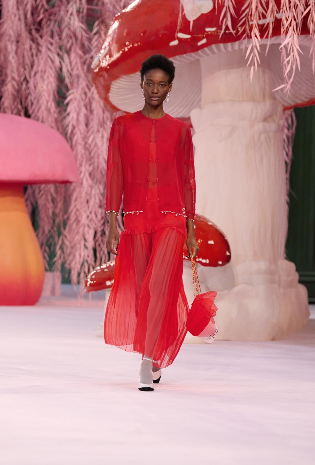 Le tailleur Chanel ouvre le défilé : gansé, épuré, interprété dans sa version la plus fondamentale, il est composé de superpositions de mousseline de soie transparente aux couleurs tendres. Comme une réminiscence, il laisse entrevoir les différentes pages de l’histoire de la Maison, mêlées à celle de la femme qui le porte : une lettre d’amour délicatement brodée, un flacon de N°5, un rouge à lèvres rouge… On distingue des objets fétiches et symboliques, en mousseline de soie ou déclinés en bijoux. Cachés dans une poche, brodés dans la doublure, glissés sur l’emblématique chaîne ou dans une version vaporeuse du sac iconique. Les symboles d’une vie intérieure se dévoilent, comme une déclaration d’amour à la Haute Couture et à celles et ceux qui la font.